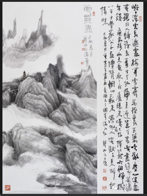 其中拉伸方式,亦可回归郭先生之《雲山无尽》,请共读右边隔水所题《满江红》一首之前五句,“岭上浮云长遮处,梅开雪霁,花径里,玉箫吹彻,尘心迷意”。在郭先生这片不见一株梅,不见一条径,更不可能听见一声箫的云山之中,郭先生欲清我辈的“尘心迷意”,问其何能为之?明日续读此画与此首《满江红》,再说。