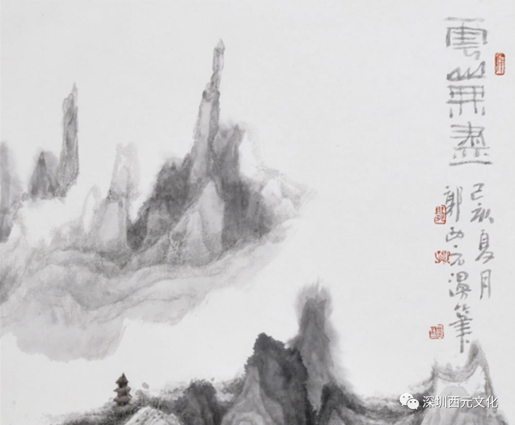 郭先生画前两层山,还在人世境界,这最后一层,已然模糊不可及,更兼山后还有山,所谓“无尽”之意,以画中之山而言大抵如此。背后无尽之山,更是无路可通,无迹可寻,其飘渺高深,有若宇宙智慧,不可名其一端,在郭先生用“禅不能言”与“禅”二印在上,已将其点出,我辈读之,自然难说其中禅理万一。