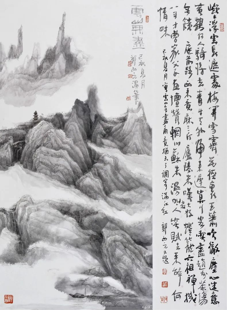 放下最后的后果不谈,即在那被停下的一刻,有些人的心理便易于波动,而导致影响诸多的决定,乃至于影响结果,这恐怕并非是理想的状态,因此而读郭先生的这幅《云山无尽》,倒是能读出些解决之道。