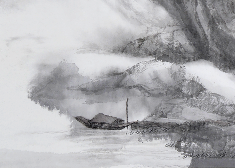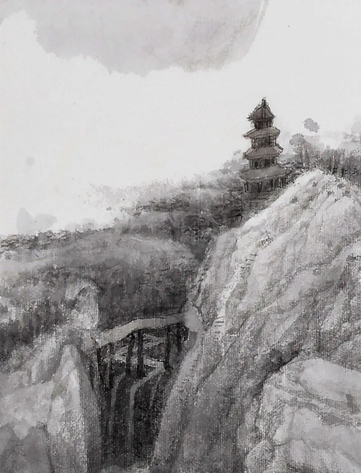 ▶《云山无尽》局部图2 此画局面,至此已能读出两层境界,一是山脚,旅人乘舟而来(或喻追求人生真谛之始,之前已或得人指点得渡),可见秀美山川,然而不见路径(能够明确找到人生前行道路之难);二是山间古刹(人生境界得升华所在),是智慧源头,虽不见路,但必有路,则路何在,其实在每个人的心中。 这两层境,在有些人那里,或许已能解决开头所说的那个问题。 一是目标,疫情发生,最大的问题便是短期节奏被打乱,目标容易不明,不妨抬头远观,古寺古塔,就在山上。