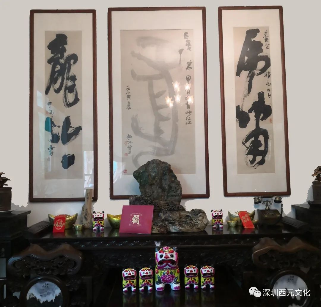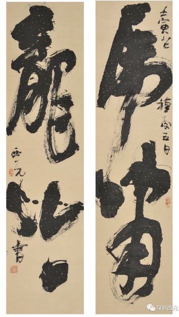 而以此理观郭先生之字,之前多有不解者。近日观郭西元先生所书“虎啸龙吟”对联一帧,又不配画,依然以甲骨文“虎”为中堂,悬于家中,气势非凡。