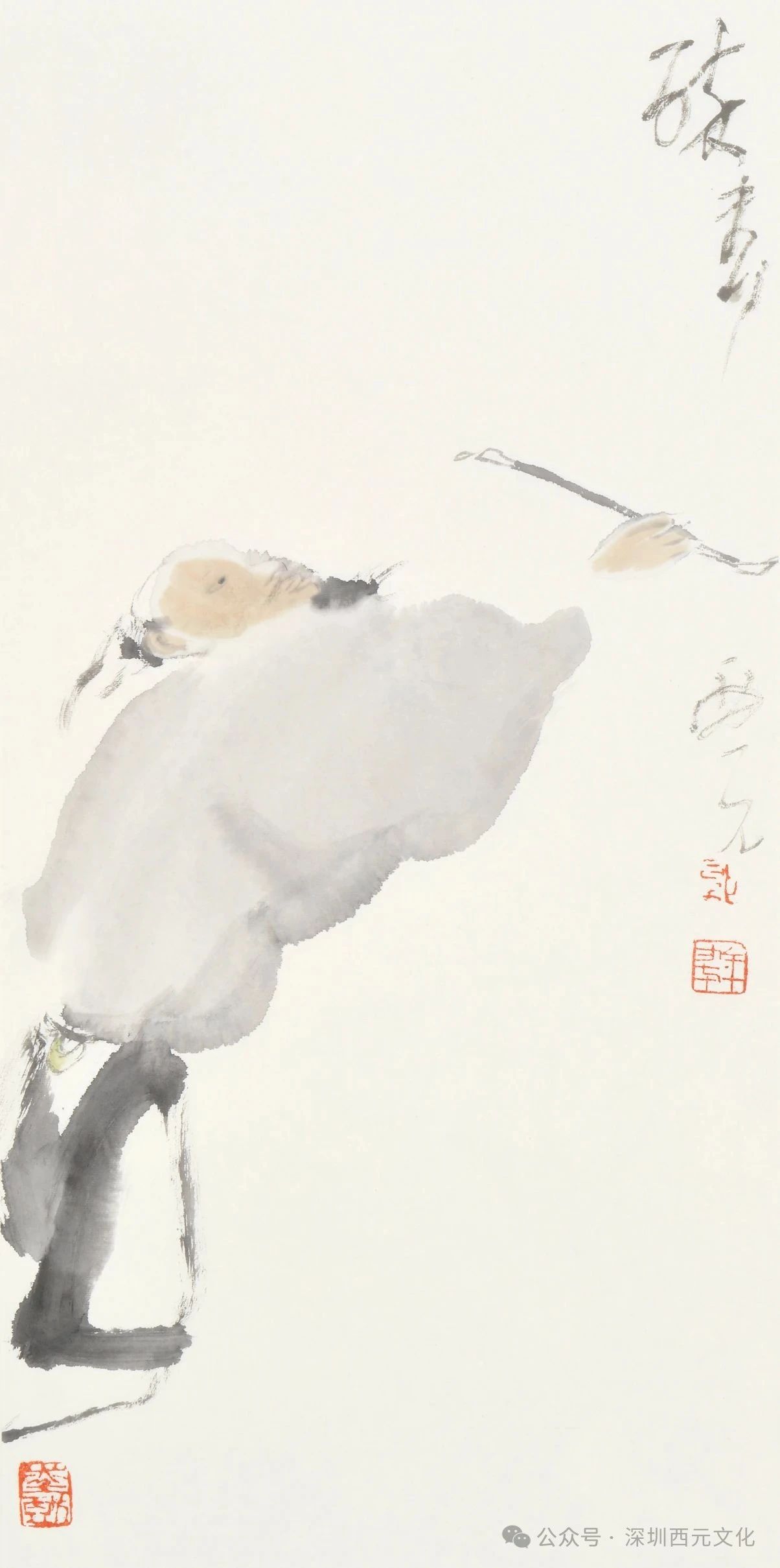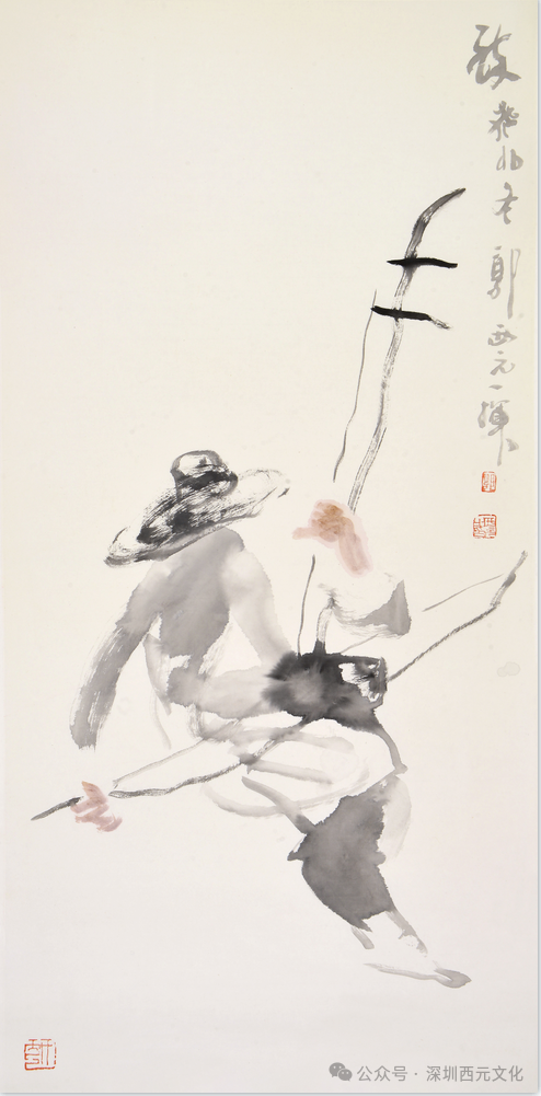 在视觉文化日益繁复的当下,郭西元以“淡极始知花更艳”的美学追求,坚守文人画的“简淡”品格。他的画面摒弃浓艳色彩与复杂构图,以黑白灰的水墨韵律与疏朗的空间布局营造“空灵”意境。这种“简”并非贫乏,而是通过“十二分观察、三分提炼”的匠心,将物象的精神本质提纯为视觉符号——如山石的轮廓线暗含书法的提按,花瓣的墨色变化承载诗意的流转,人物的动态神情凝聚着对生命状态的哲思。
