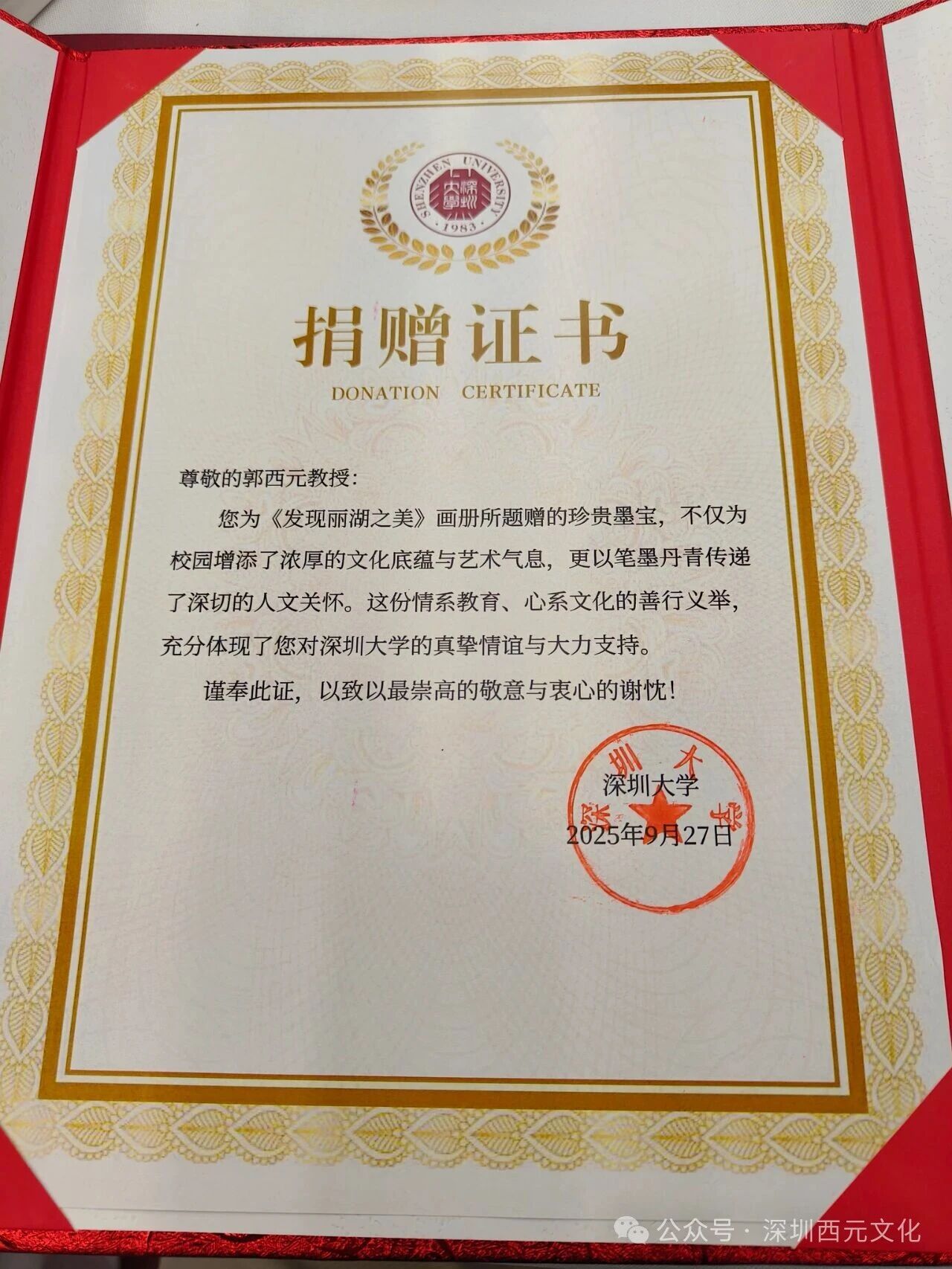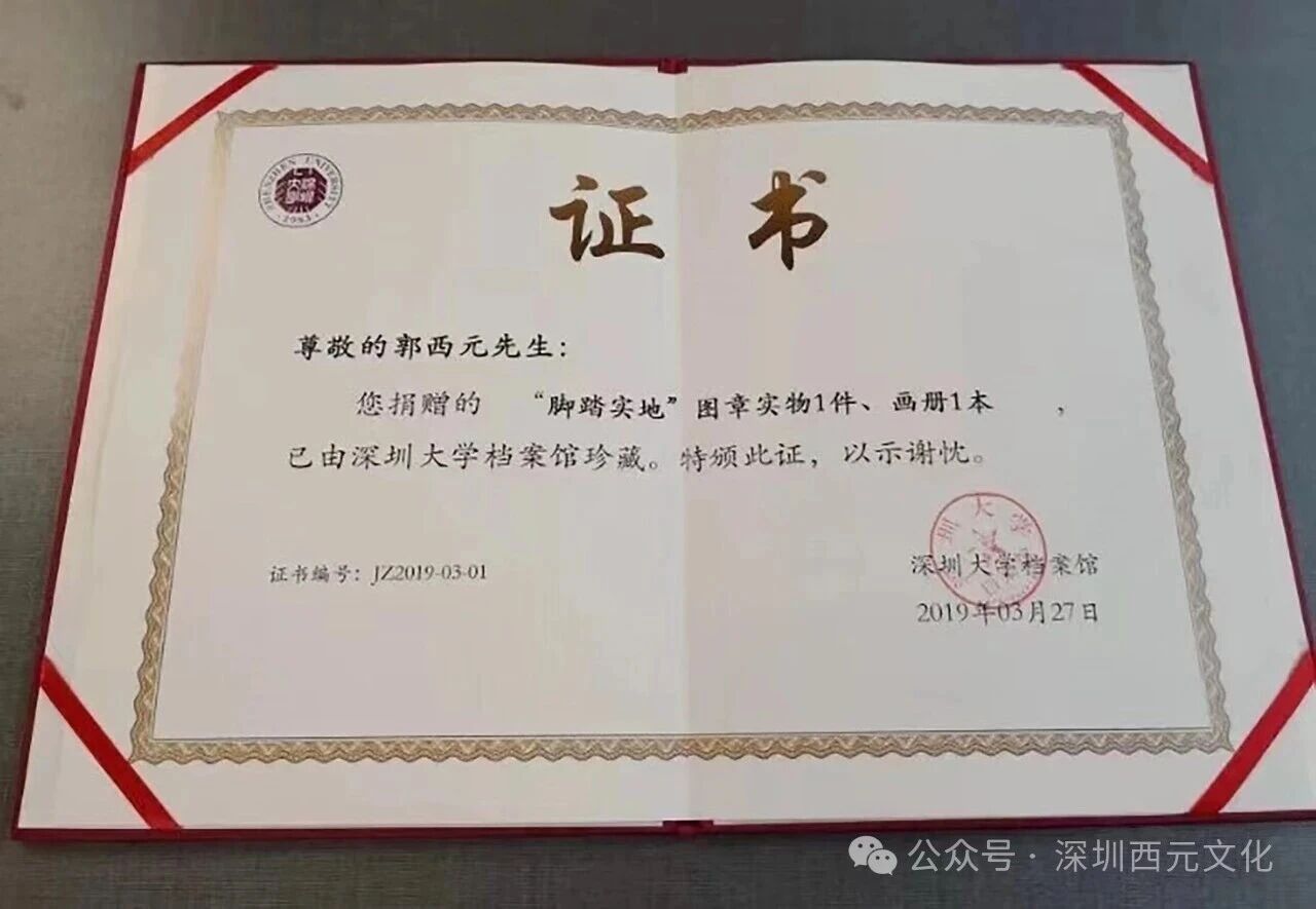 9月27日是深圳大学四十二周年校庆,郭西元教授收到一份深大的礼物——《发现丽湖之美》的捐赠证书。郭西元老师1984年来到深大,创办深圳大学工艺美术专业、参与创办深圳大学艺术设计系和艺术与设计学院。从为深大题写校名,到铸就“脚踏实地”精神印记,留下古石今人的文化烙印,再到“发现丽湖之美”,郭西元教授与深大四十二载成长史交织交融,渊源深远,共同见证了一段无声而厚重的学府历程。