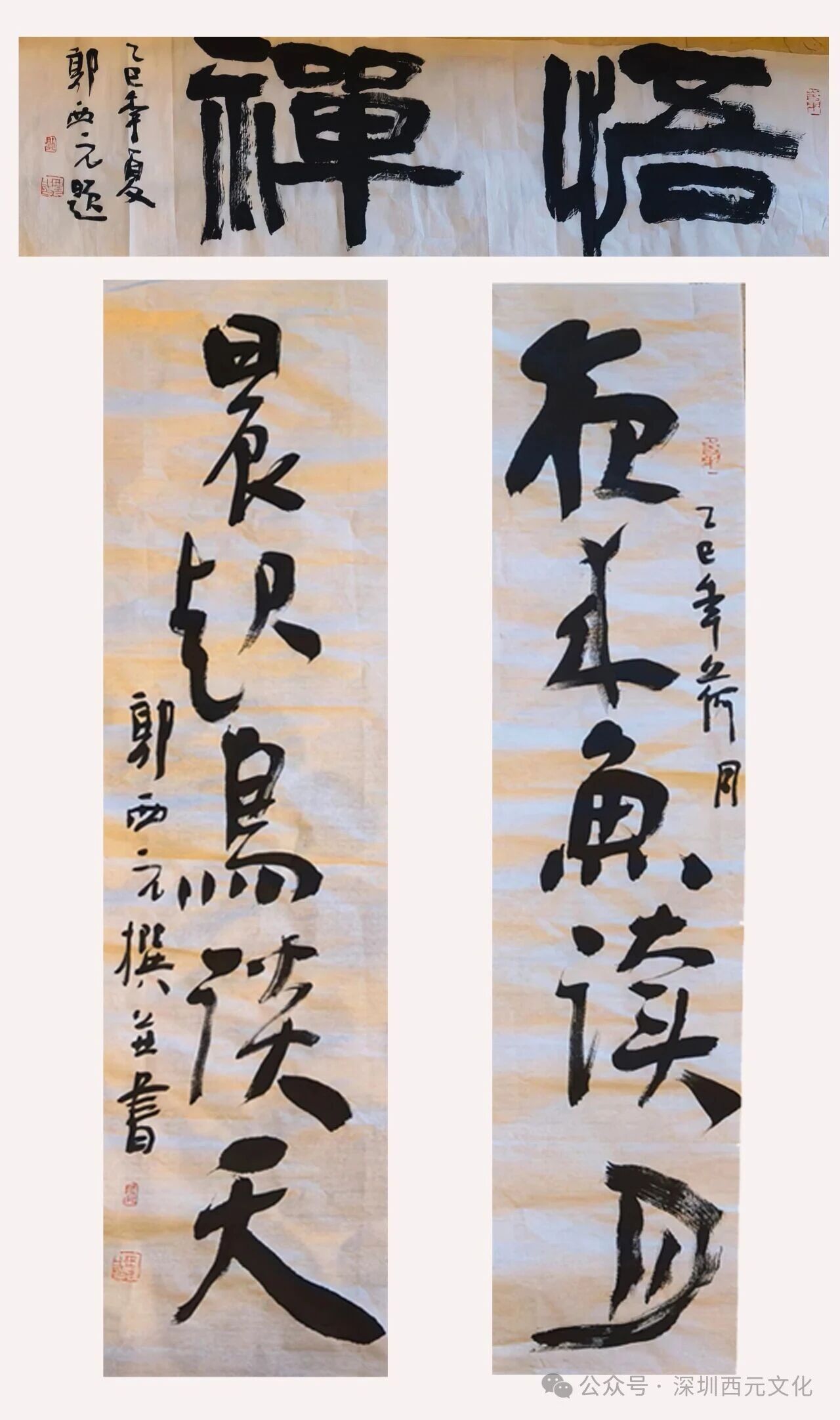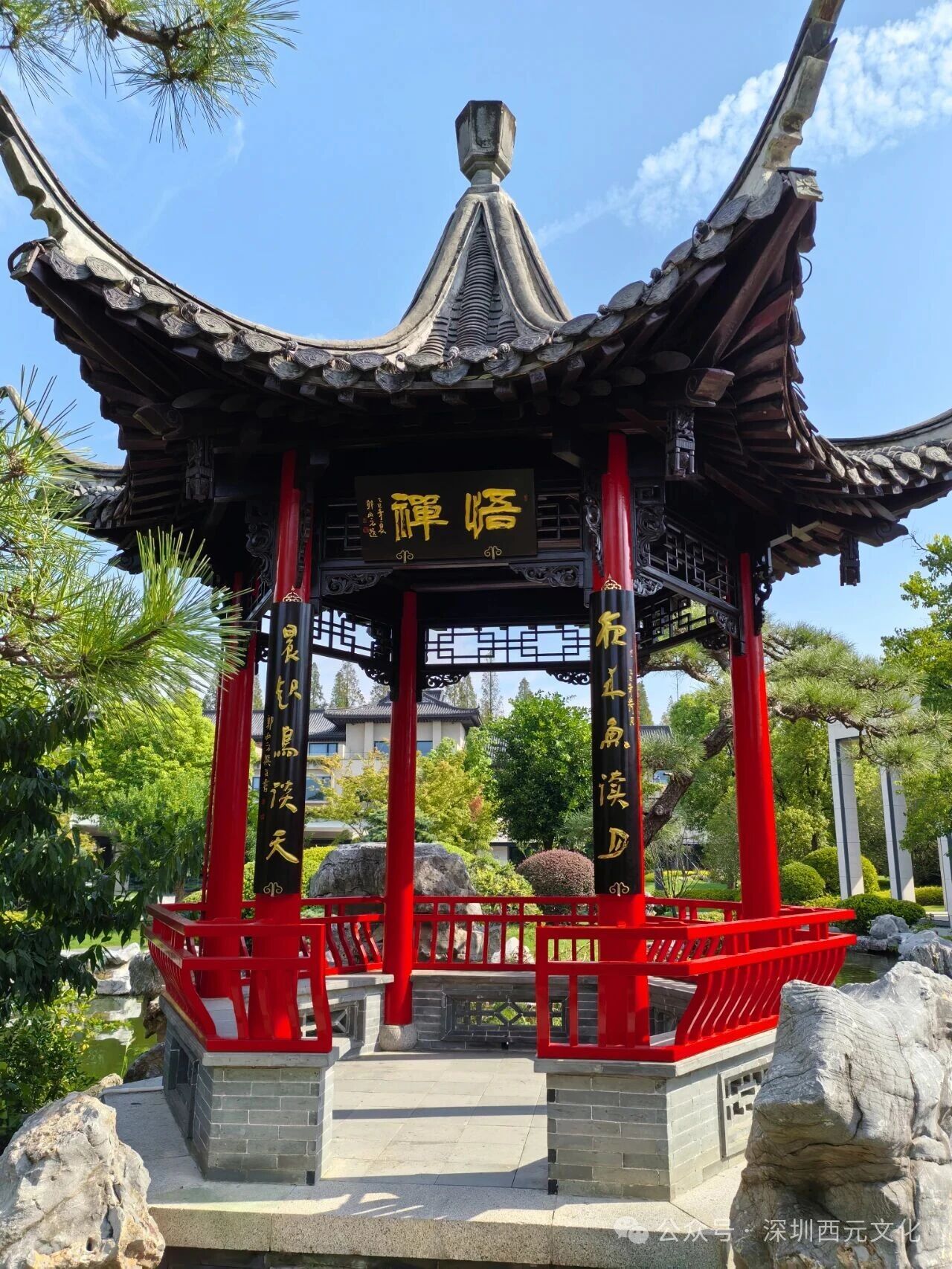 馥芳园前,另有一亭。碧水涵虚,锦鳞戏藻,可观鱼悟道,察鸟会心,于是得“夜来鱼读月,晨起鸟谈天”之联,以“悟禅”为匾,便自请缨。万庆董莞尔曰:“先生真文人也!”遂飽蘸浓墨,书此二联。