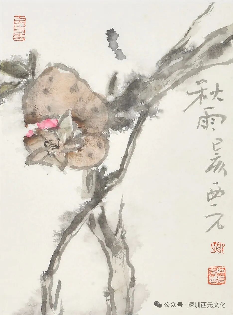 郭先生以简净笔墨,将秋的清寂、榴果的丰实与道家幽思化入一纸湿润,观者凝神望去,便能从“榴实沐雨”的景致里,触到自然深处关于成长的密语。也正因这般以小见大的表达,才让文人画有了最耐人寻味的意趣——借一角自然,见天地生息,见性灵本真,见自我在岁月中的倒影。