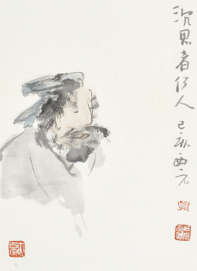 此作之中,老者巾帻以干枯笔墨勾廓,复以淡青轻染设色,线条虚灵,墨色淡逸中又添几分清润。松逸的巾帻斜覆头顶,笔墨与淡彩于边角自然晕散,不见半分刻意雕琢。这般笔墨设色,既透出布衣文人不修边幅的随性,亦藏着一份超脱世俗规束的放达。