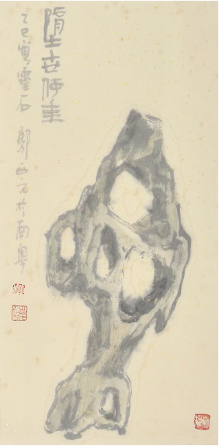 郭先生许是选了带金斑的老纸,先以枯笔勾出湖石嶙峋骨相,再以湿墨晕染。老纸肌理绵密,水墨顺着纹路缓缓渗化,石周便洇出一圈温润水气,朦胧间更显通透。那“瘦透漏皱”的姿态,在枯笔的刚与湿墨的柔之间立起,连纸间金斑也一同晕入空濛古意里。