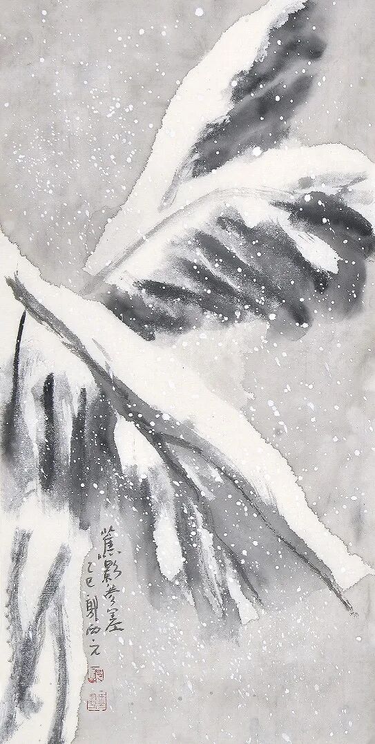 那份南艺岁月的生活细节,经数十载沉淀与淬炼,早磨出醇厚深湛的功夫。以实景立骨,以文心抒怀,繁简之间,黑白笔墨里既有清润雪蕉,更藏着岁月打磨出的文人风骨。观者赏画,见景、品墨、会心,自然能读懂雪压芭蕉背后的淡泊与坚守。画左侧题“蕉影参差”并纪年钤印,书画相映,更添几分文雅。