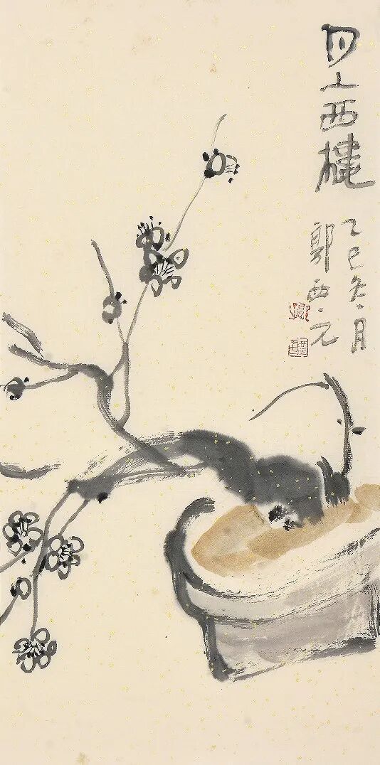 郭先生这帧《月上西楼》,初看只是案头一盆梅花,梅枝向左斜出,上有生发之势,下含垂落之态,不躁不浮,沉稳内敛。