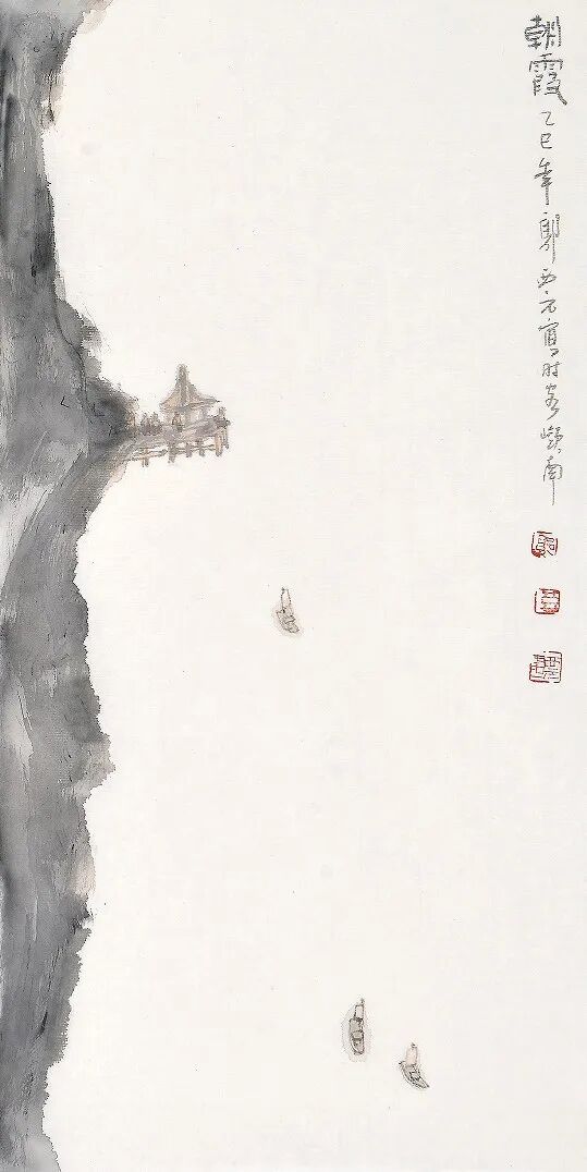亭子建在常人难至的地方,船行在没有岸可回的水上,两样都不沾实地,却又各自安稳。伫立观之久了,才恍然懂得,这并非寻常山水。传统山水,总要给人留几分可游可居、可进可退的余地,此画却全然没有。它只呈出两境:人立于本不该有亭的高处,舟驶向本不必求岸的远方。