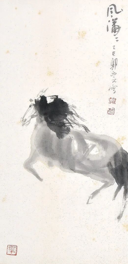 右上角“风潇潇”三字,落笔自带风势,苍劲中藏着洒脱,与画中奔马浑然一体。先生画马,不重描筋骨,只以淡墨写身,浓墨泼出鬃尾,寥寥数笔,骏马便踏风而来。前蹄轻扬,眼神笃定从容,不见半分慌乱;头尾浓墨翻卷,如风乍起,四蹄腾空,不着尘泥,留白处如旷野无边,无拘无束,只存一股一往无前的意气。