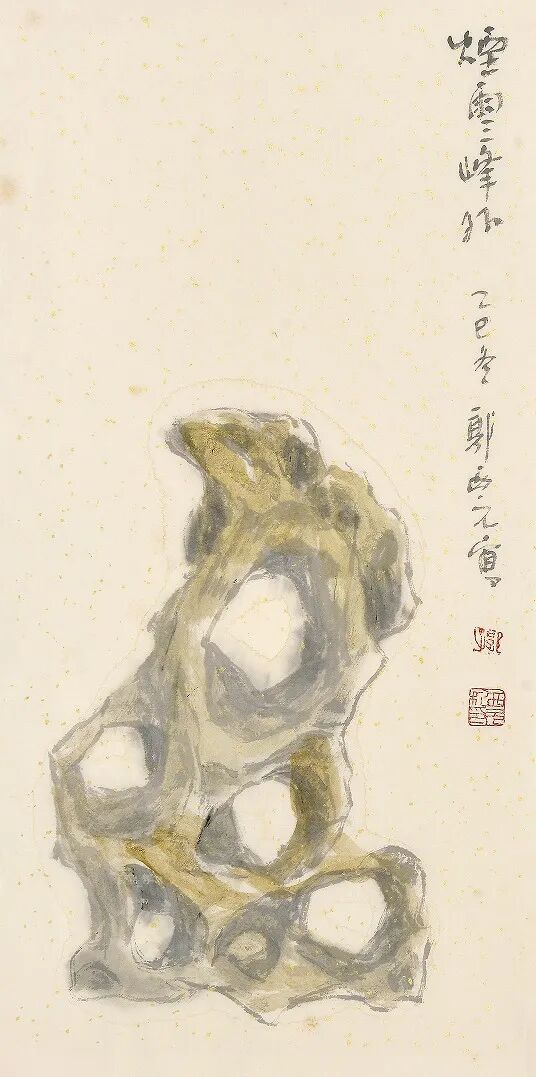 静观此石,太湖石玲珑多孔,“三峰”本是古典山水里的旧意象,高远、清寂,自带古意。画中题句“烟雨三峰外”,语出东坡《和人假山》:“试观烟雨三峰外,都在灵仙一掌间。”昔人赞假山能缩天地于咫尺,今日我们观石,亦是在方寸之间,寻一份超脱尘俗的心境。