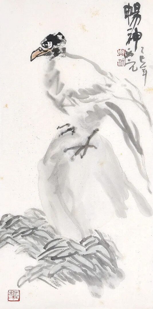 它静立石上,颈羽微耸,目光斜望远去,从容不迫,无躁无惊。淡墨轻写羽翅,笔意松灵却内含筋骨;唯头顶与眼瞳用墨厚重,一点便提住全幅神采。