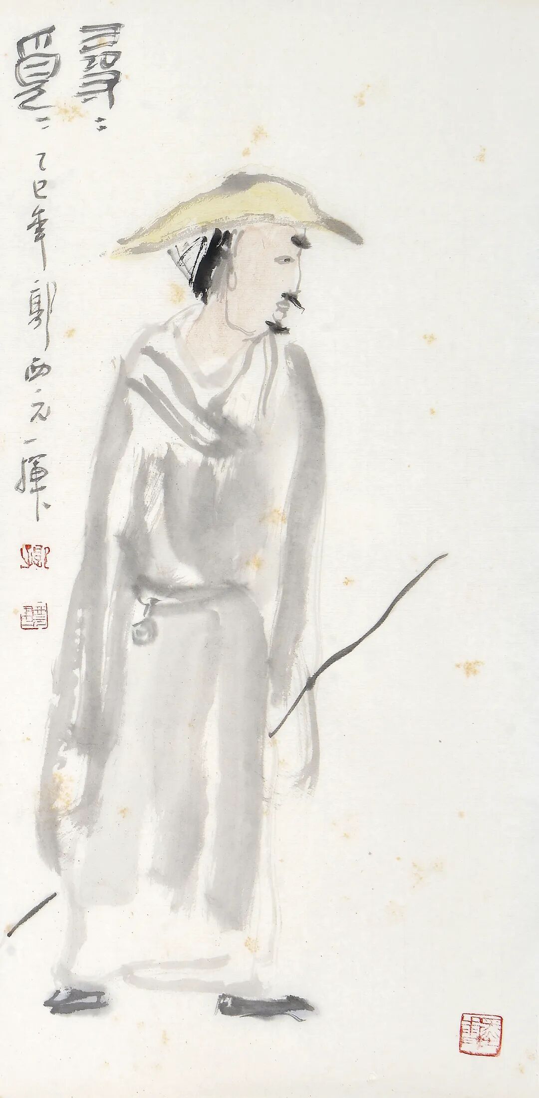 画中人持杖独行,笔墨极简,淡到近乎无痕。素纸之上,留白阔远,似可容下半生心事。题款以飞白篆书写就,笔意枯润相生,纸色从笔画间透出,将旧词里的凄清,尽数化作走过岁月之后的沉静与自持。这寻觅,原不是向外追索,而是向内归心。