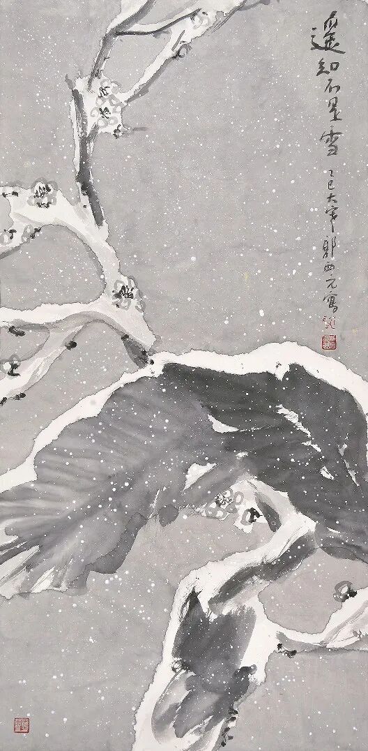 郭西元先生则承其余韵,再续斯文风骨。 早年久居江南,秦淮雪色、庭前蕉叶、墙角寒梅,皆是旧时心境;后来客居岭南,南北岁月相融,笔墨里便多了几分温润与旷达。他作画不摹古人形状,只取那一点精神:雪意清浅,梅枝瘦劲,蕉叶被雪轻压,筋脉依旧挺然。笔墨温润内敛,无躁气,无狂态,只存一份笃定沉静,接续的正是千年文人清而不弱、守心自持的风骨。画题仅取“遥知不是雪”,诗意点到即止,余韵自出,不添雕琢,不扰画面本真。