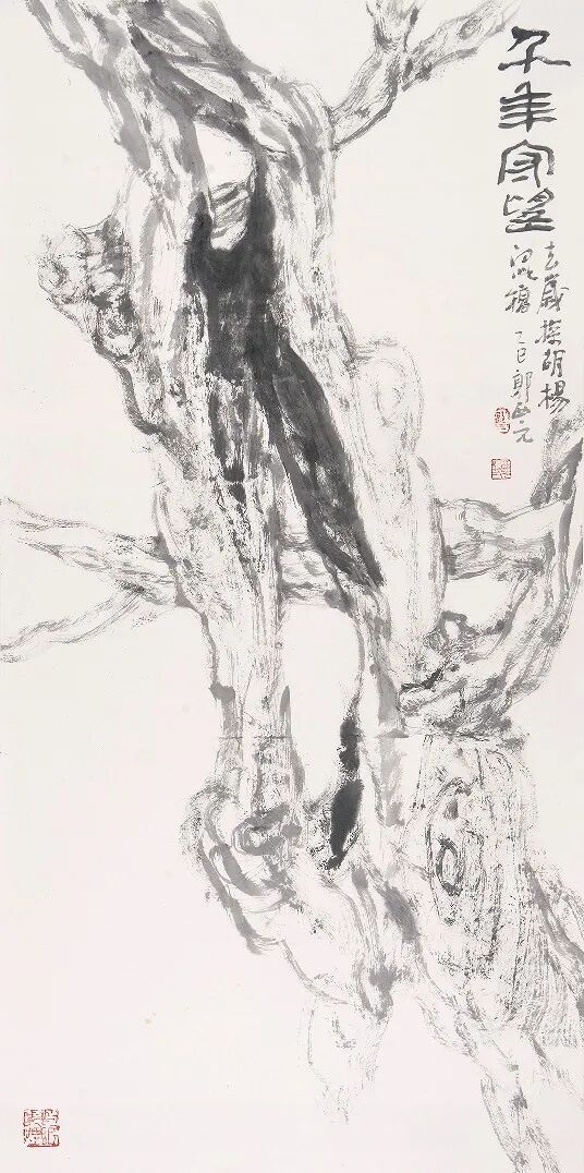 笔墨枯淡处,是千年风沙蚀骨的沧桑;中间浓墨沉凝,正是胡杨生生不息的生命力。不描形貌,只写精神,一枯一活之间,把胡杨“生而不死、死而不倒”的魂魄,稳稳托住。