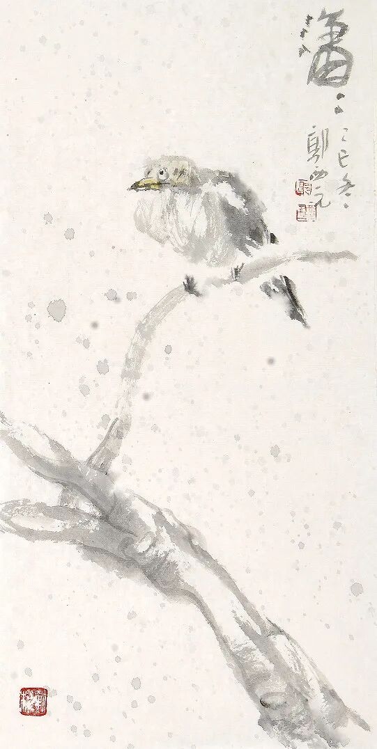 画中枝干疏朗自然,不求刻意塑形,只重整体气韵。数点墨痕轻稳落下,似疏雨潇潇漫洒,留白是心境与雨意相融的悠然。枝头栖雀安然静立,眼周一点暖黄提气,神态平和内敛,笔墨看似简淡,却处处见扎实功底。平淡从容,自写心境。
