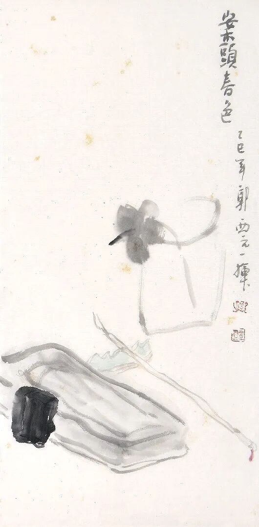 画中正是这般春意。寻常案头清供,素瓶淡墨轻勾,一枝春色斜倚而出,不张扬,不浓烈,只以简淡笔墨写出清润生机。旁侧浓墨凝就的墨锭,与淡笔写就的砚台、毛笔相映,浓淡相生,自有笔墨的节奏与章法。先生落笔从容,删繁就简,把春日的温柔与书房的清雅,一并收在尺幅之间。