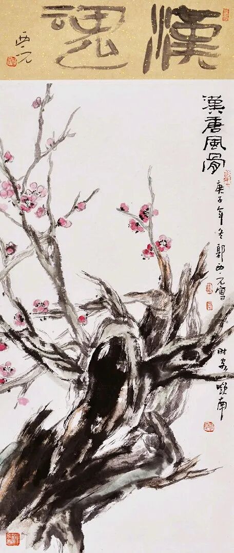 以画家眼观,“汉魂”是根,“汉唐风骨”是形。郭先生写梅,不做孤芳自赏之态,而写苍劲如铁的老干——墨色沉厚,皴裂如历遍风霜的脊梁,枝桠向天,几点红梅疏朗而不媚。这是他对汉唐刚健精神的追慕:魂在骨里,骨在笔端,枯而不死,寒而开花,是民族千年未折的气骨。