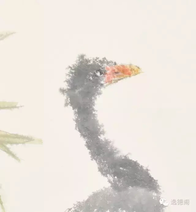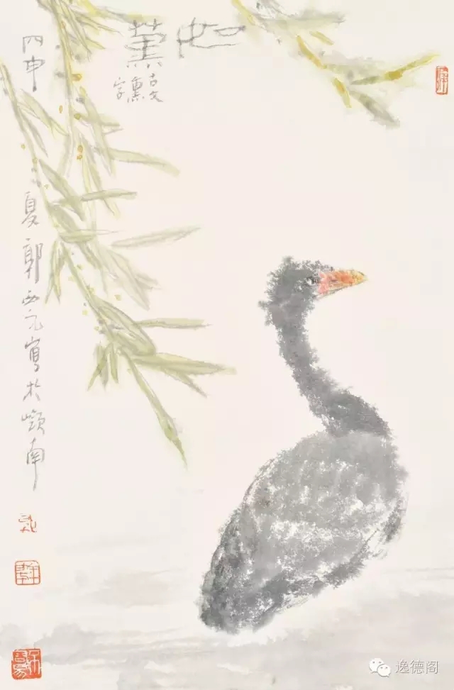生宣纸上,湿笔写下鹅的曲项,且不着急,等待墨色的晕散,生宣与水墨的互相作用,成就了鹅颈的绒毛质感;鹅身点点湿笔,勾勒又用枯墨,片片晕散与丝丝飞白,写成了这春水中的悠游之态。鹅眼的点睛,孤傲自得,在一片杨柳春风的微熏之下,却有一份清醒与冷峻。