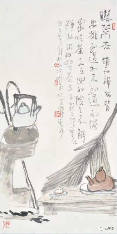 画中有诗、诗意画境。这是郭西元文人画的灵魂。郭西元有幅“水仙”,画中题诗“远看一堆乱草,近看信笔横扫。劝君莫论巧拙,免得枉人烦恼”。这既是对这幅画的诠释,又是做人做事的禅悟。自古以来,文人画充满诗境,无论反应什么情绪,都是真情的流露和诗意的表达。如元代王冕题墨梅、白梅都反应作者孤方自傲,高洁守志的文人、士大夫情结。“我家洗砚池边树,朵朵花开淡墨痕。不要人夸颜色好,只留清气满乾坤(墨梅)”,“冰雪林中著此身,不同桃李混芳尘。忽然一夜清香发,散作乾坤万里春(白梅)”。宋代朱淑真“土花能白又能红,晚节犹能爱此君。宁可抱香枝上老,不随黄叶舞秋红”,都是反应超凡脱俗,洁身自好,不与世俗同流合污的高尚品格。明代徐渭题墨萄葡“半生落魄已成翁,独立书斋啸晚风。笔底明珠无处卖,闲抛闲置野藤中”表现作者怀才不遇,生活落魄的压抑悲愤的心情。当今许多画家甚至名画家,不会写诗,很多画都很不错,但不会题诗、题款,或抄录古贤诗词,或寻章摘句,没有自己的思想,也没法用诗句来表达。郭西元诗书两畅,使他的画作充满古意和士大夫情怀,又以简、雅、拙、淡的诗、书、画表现方式使人一见倾心,再见难忘,越品越有味。