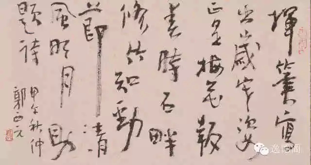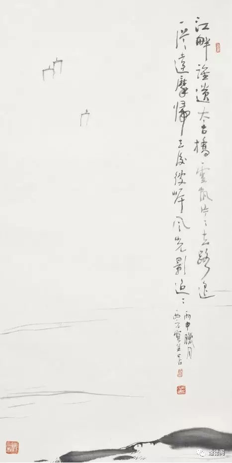 诗是人类语言与智慧的结晶,是抒发作者思想情感至高精神层面上的艺术形式。郭西元的诗是写在画上的。“石畔修竹知劲节,清风明月助题诗。”诗题在了画上,画溶于了诗中。 做为中国文人画著名画家,郭西元集诗、书、画、印“四绝”为一体是业界所公认的。 品读西元的画,彷佛感悟到一种飘逸灵动诗意之美的意境和用心于无笔墨处的高雅。 在画面偏右下方,低低地拖出两笔 润润的濡墨,似两块露出水面的岸;在中间连一小木桥的左上方,似不经意间地随笔拉出了两片水纹。而在画面临近致顶的左上方,逸笔草草,错落而简约地勾勒出三两帆影。使整张画大面积的布白,所画部分彷佛是纸面的点缀或边饰。两行题跋从右上角起落笔,洋洋洒洒压在了画面上。这就是郭西元题为《江畔》的画作;“江畔谁遗太古桥,雪帆片片去路遥。一從达摩归去后,彼岸风光影迢迢。”
