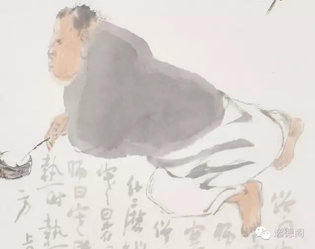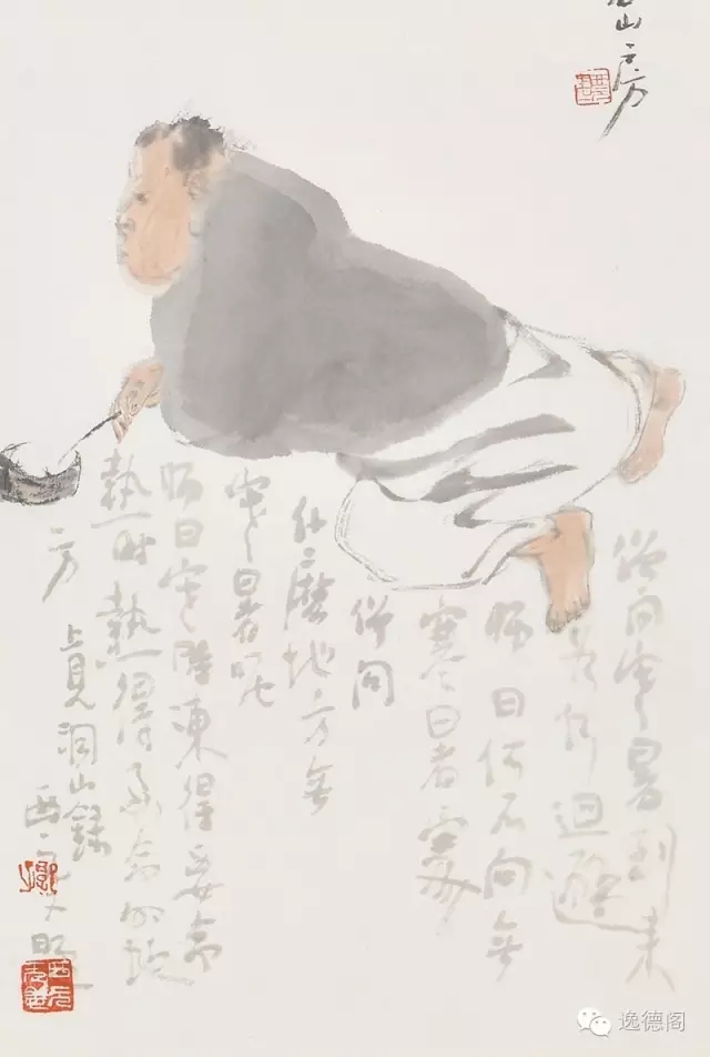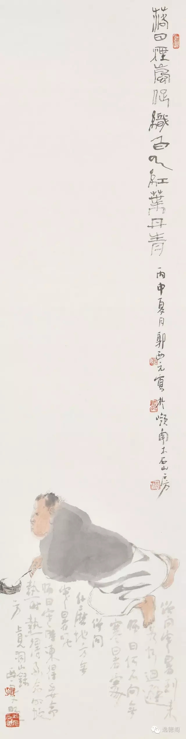 四平尺余的纵幅,似乎只在画面下三分之一的空间中展开,一名童子跪趴在地上,支肘弓腰,单手执一芡草,正在逗引眼前罐内的蟋蟀。童子身体,墨色分层,散裤勾写,用笔用墨,无一丝犹豫,大写意极传神。童子面部神态,嘴微噘,双目紧盯着蟋蟀,鼻孔似有微翕,这份专注的神态,全在寥寥数笔之中。童子手执的芡草,虽柔亦刚,草尖丝丝缕缕,枯而不断,很是写出了芡草的趣味。