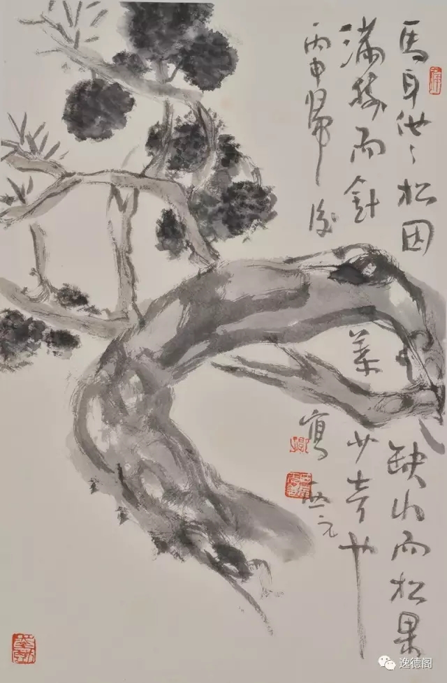 画上的松,虬劲却似枯干,有老而弥坚之感,松果以浓墨点写,再以淡墨敷之,丰腴茁壮,是生命旺盛的象征。在树干与树枝的及扭曲转折间,自然呈现出松的坚韧不屈。