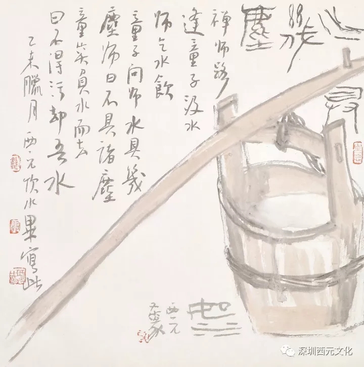 观画,只见画上一桶一担,均施以淡赭,旧木粗绳,扁担斜穿画面,上为题而下为画,正好两分。