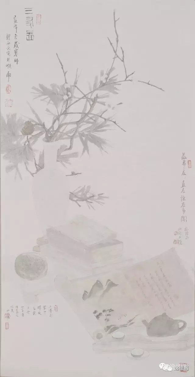 知道了这些道理,再来看看作者所画的交友待客之道。画中画茶壶一,茶杯二,作者清茶一杯,以待佳友,二人所乐者何?作者画中作画,将米南宫《春山瑞松图》续续展开,好友相聚,共读佳作,岂非乐事?再看其后,“长乐未央”瓦当一块,所谓秦砖汉瓦,藏家珍视之。再看书上,乾隆“石渠宝笈”钤印在上。以上种种,皆是郭教授细微用心之处。