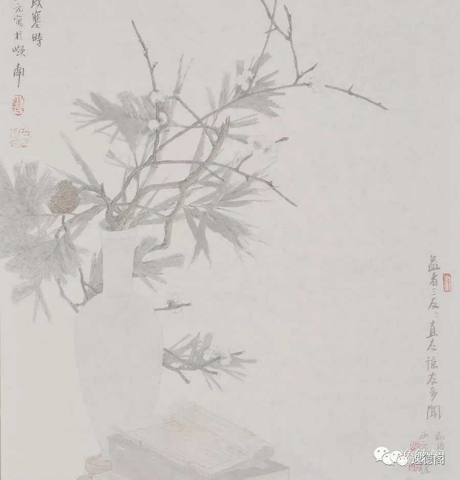 郭西元教授此画题名《三友图》,首先映入眼帘的便是这岁寒三友,高高的瓶中,竹青翠;梅冷艳,松挺立。仔细看郭教授的运笔,松针笔笔挺立,钢且有骨;梅花花蕊细腻,而不媚俗,枯荣皆集于一枝;而竹有湘妃之态。布局高低错落有致,最喜人的当属那一枚松果,刻画细腻,饱满丰实,正是美满幸福的寓意。