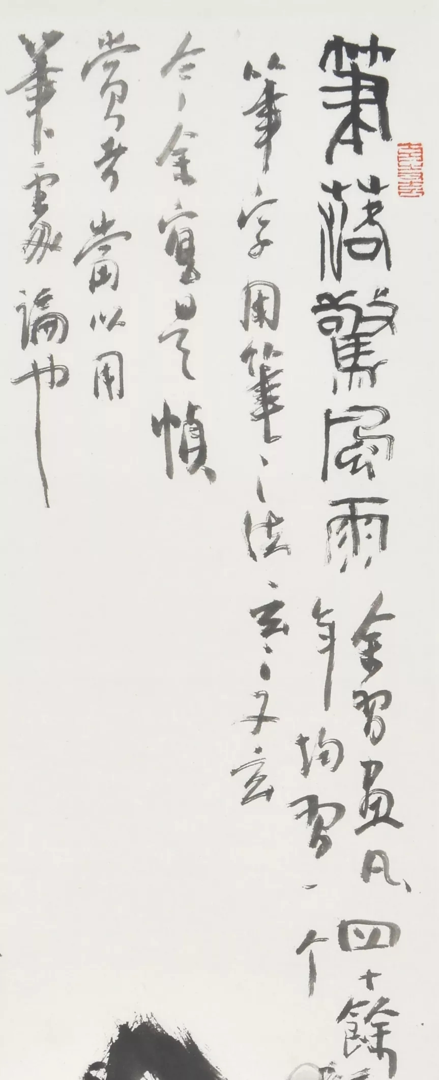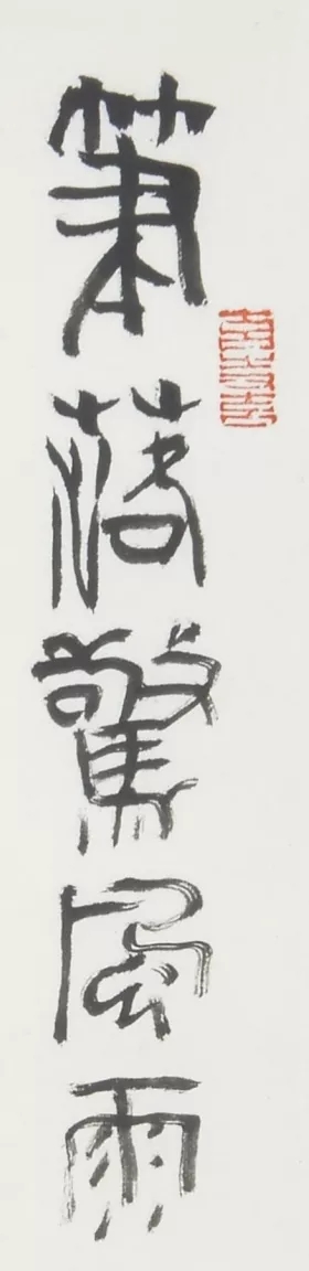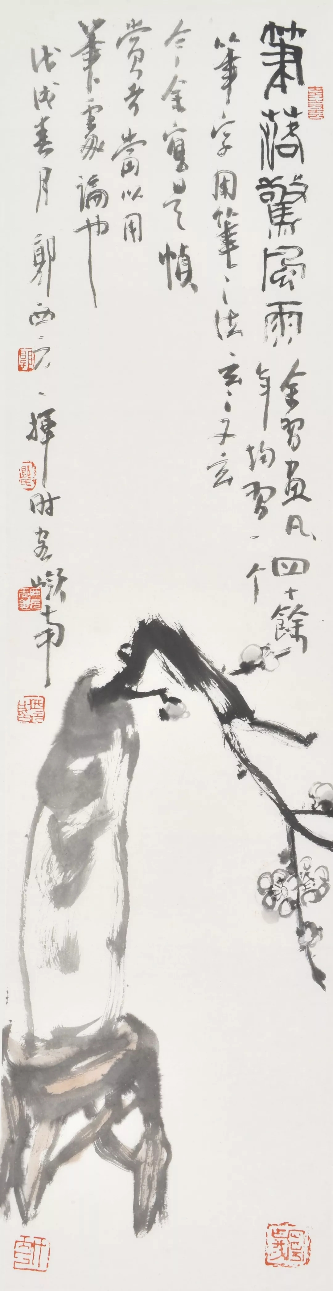 “笔落惊风雨”原是杜子美用来赞叹李太白诗文的,郭先生借用来讲中国画的用笔却也是意外的贴切。用锋的“藏”与“露”、转折的“提”与“按”,拖笔与逆锋所呈现的老辣与飘逸……这些在这一帧画上的结合与运用,最终呈现出的是眼前这个素朴敦厚的陶瓶,一株苍老虬劲的梅枝与或开或掩的冬梅;又见其中或急或徐的笔速,呈现出来或润或枯的墨韵,也实在大有“笔”之韵味。