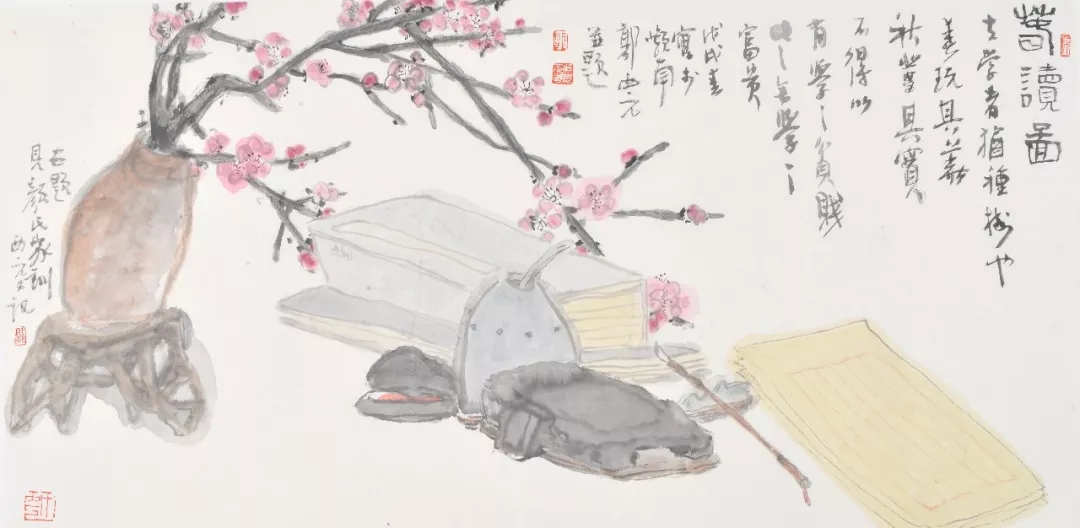 盎然的初春景色,被郭先生搬到的案头,绽放的梅花作为交错的背景,衬托的是案头那即将打开的书卷,预备好的笔墨纸砚,在春光中展开在案头,郭先生甚至刻意施水来呈现这个案头在初春中的生机与光芒。