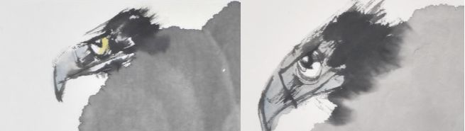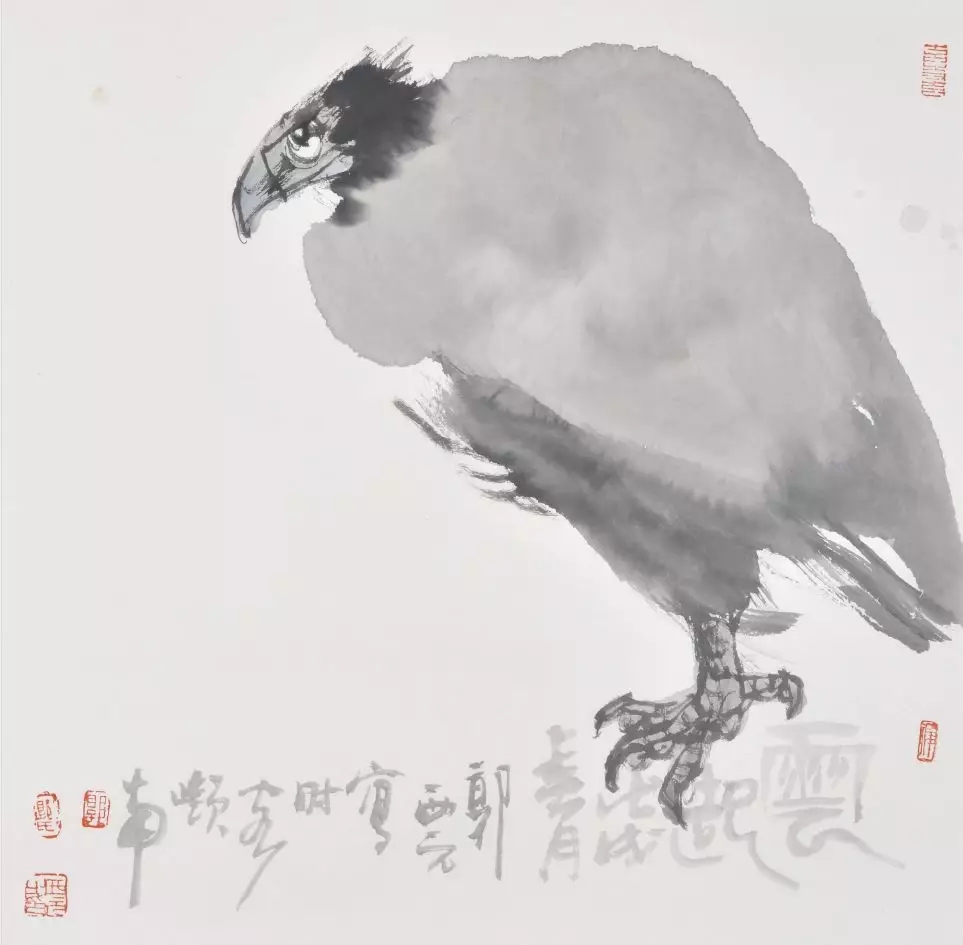 上一篇赏《峙》一幅,是郭先生写意的鹰,今日又来一只鹰,题名《云起》,若说自《峙》中,笔者读到的是一场犀利高手的等待,到了《云起》,则笔者除了等待之外,更看到一场由鹰而到人的领悟。