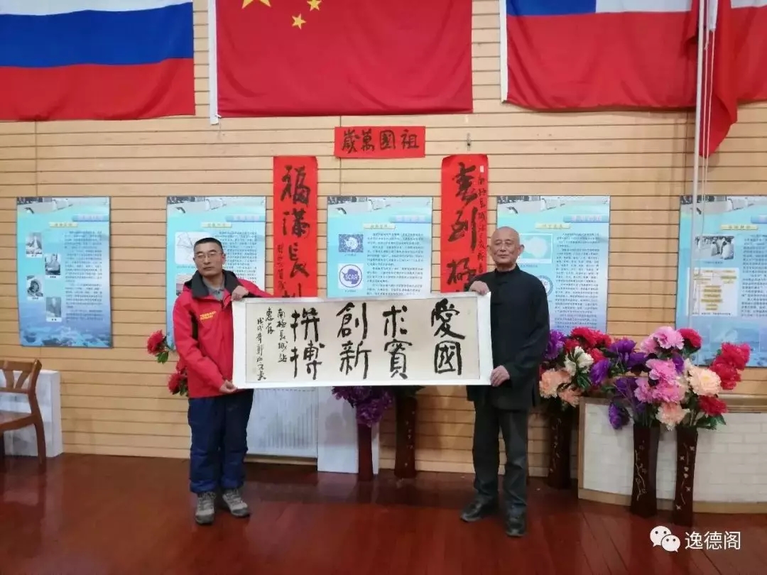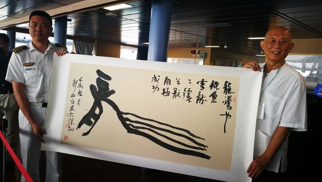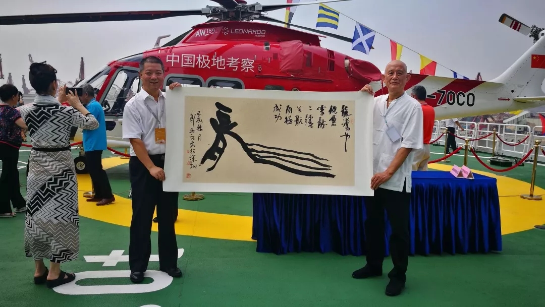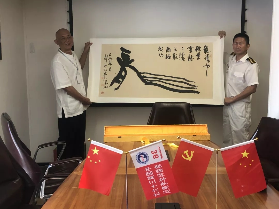 今日上午10点,郭西元先生亲手将作品《龍腾也 祝愿雪龍二號首航南极成功》正式赠予极地科考站。