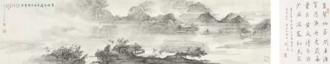 又是秋仲,这使我想起了郭西元的一件精品佳作《董其昌诗意图》。此作当弥足珍贵。2011年秋,西元头部意外受伤,需手术引流顱内积液。术后复查时,竟仍有医生建议进行第二次顱脑手术!就是在这样病情充满着变数,需绝对静养的恢复期间,西元竟画出了如此经典之作。按医嘱,他当时应以卧床静养为主,不可以有猛然、急剧地举止;不可以有较大幅度的动作,诸如挥毫泼墨大写意作画䓁,亦不能多用脑。按西元自己说法,他是“间时伏案习古,月余成此。”这幅长210公分,髙78公分的画作,构图疏落有致,群峰叠出,烟云流润,画境深邃。山中飞瀑流泉、廻流萦绕,汇入深溪。远山隐隐有寺,钟声 杳杳;近处溪桥洲渚、疏柳泊舟,丛竹林舍相映成趣。正应了“案有黄庭樽有酒,少风波处即为家”的山林隐逸情趣。