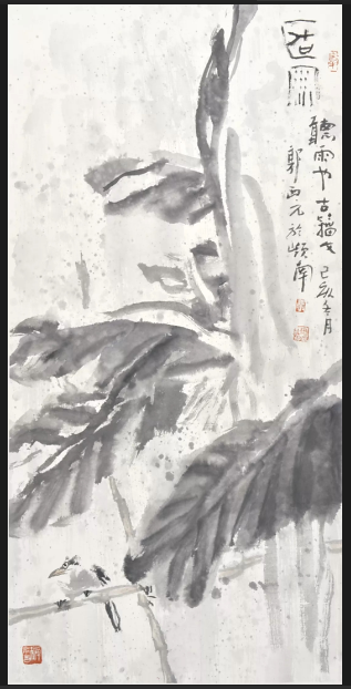 读郭先生的画吧,一只被淋湿的鸟,在簌簌的雨中,静静地站在篱上,眼神里有的最多的是淡然,雨是“无情”的,却有意无意地在片片芭蕉上击打出节奏,或细碎如粉,或颗颗如珠,鸟是“无心”的,却如此的专一,就在这芭蕉下听雨。这就是“当下”,是不能言之禅。