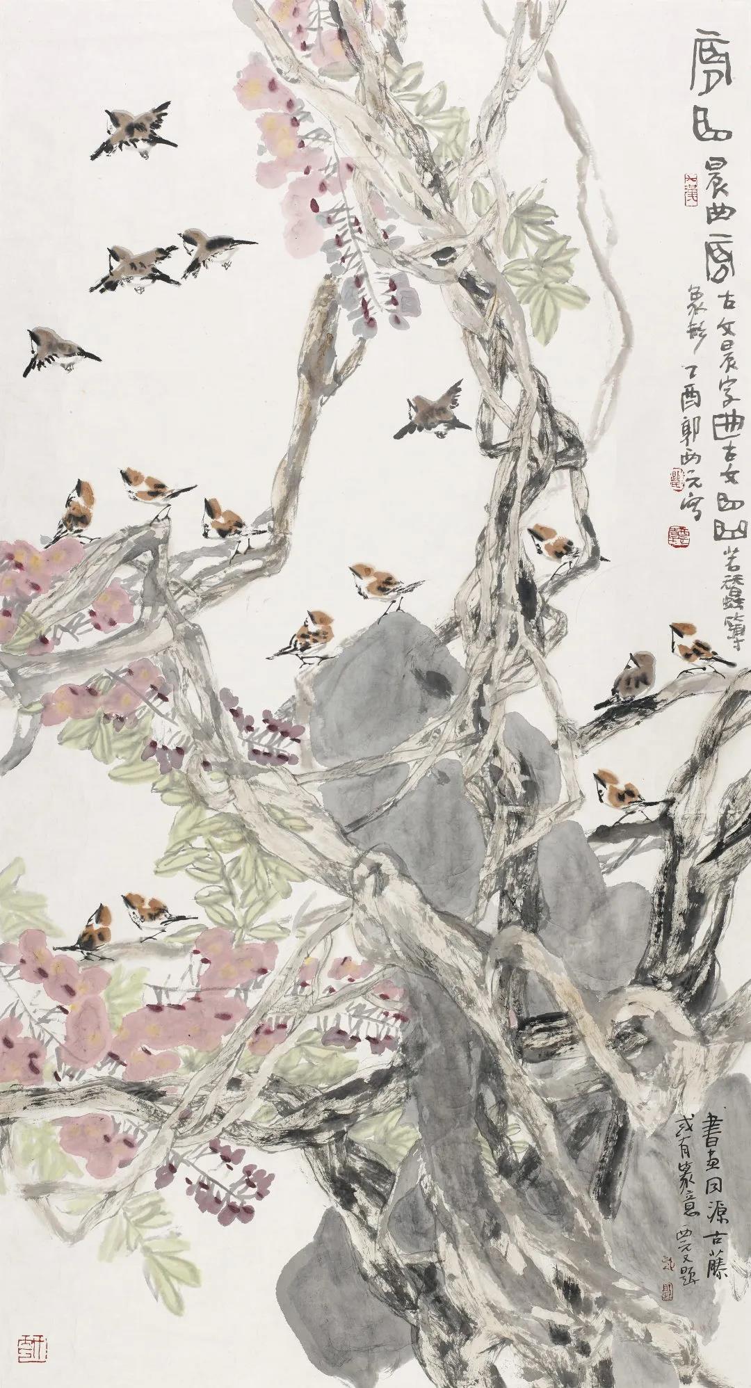 文人画倡“书法入画”,郭西元深喑此道。《晨曲》是他的一幅极见功底的画作,画面上古藤盘屈错落,倚傍奇石,紫花斜垂。十六只麻雀或棲或飞,或伏或仰,仿佛在晨曦中嘁嘁喳喳,一片生机盎然。画面题款有“书画同源,古藤或有篆意”之句。书法入画,篆筆入画,莫过如此。