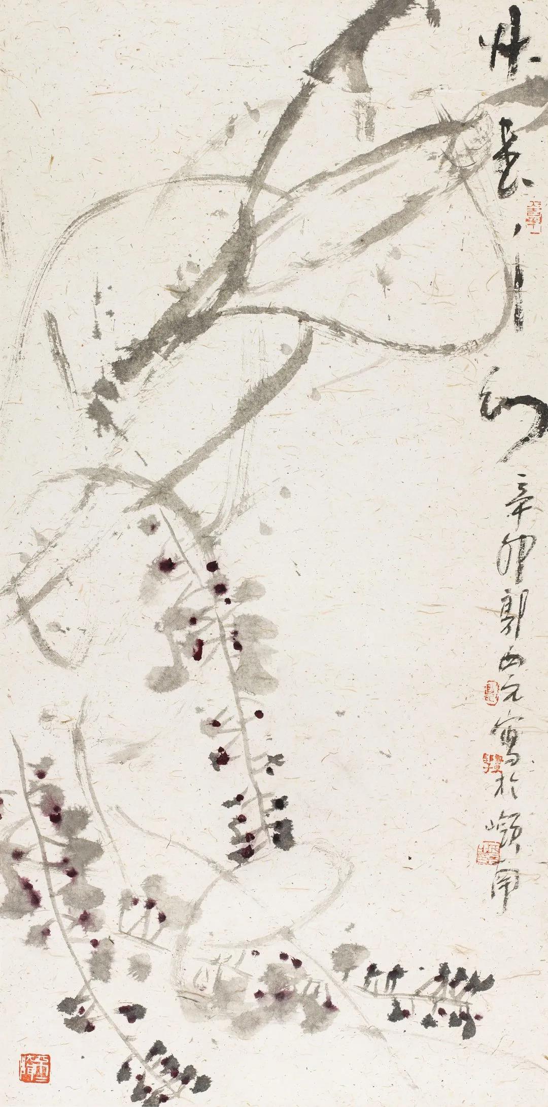 另有一画,西元索性题名为《草书之幻》。意筆草草,走筆龙蛇,直抒胸臆的数枝枯藤,点缀着扶疏的嫩叶和零散的紫花,藤耶?书耶?令人如痴如醉。筆意离不开墨色,筆因墨而留痕,墨附筆方出五彩。