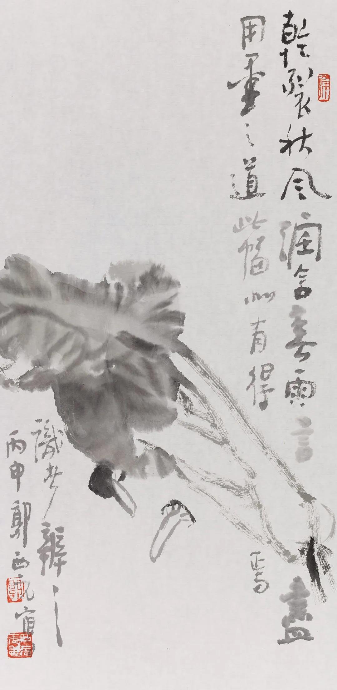 西元作《干裂秋风》图,以淡干筆拖出交媾菜梗,枯干浓墨扫出菜根,湿淡墨濡染菜叶,干筆点出三几小蘑菇。题曰,“干裂秋风,润含春雨,言尽用墨之道,此幅似有得焉,识者辨之。”由此,西元对筆墨的理解及功夫可窥一斑。