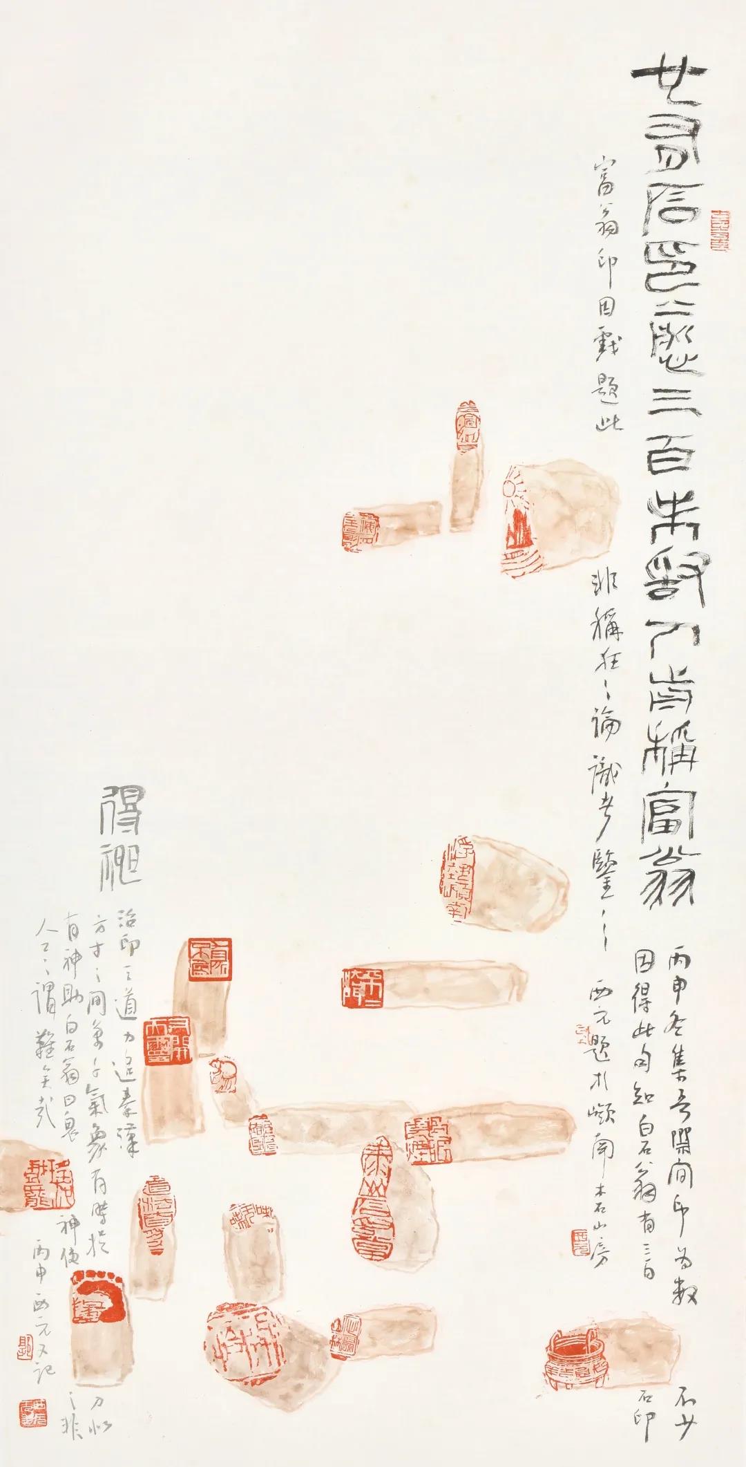 后来西元作《也有石印愈三百》图,画面错落有致,林林总总共画了十八枚印章。所画之印或长或短、或园或方,或肥硕而墩实,或瘦狹而修长;印面则或半残、或方整、或扑拙、或灵秀而各具其态;文字则是或甲骨、或钟鼎、或篆籀、或扑形而相得益彰。西元用篆书题,“也有石印愈三百,未敢人前称富翁。”遂题,“丙申冬,集吾製闲印,为数不少,因得此句,知白石翁有三百石印富翁印,因戏题此,非轻狂之论,识者鉴之。”又题,“治印之道,力追秦汉,方寸之间,万千气象,有时捉刀似有神助,白石翁有(鬼神使之非人功)之谓,难矣哉。”西元治印之道,製印之数已亦步亦趋步白石老人之后尘。